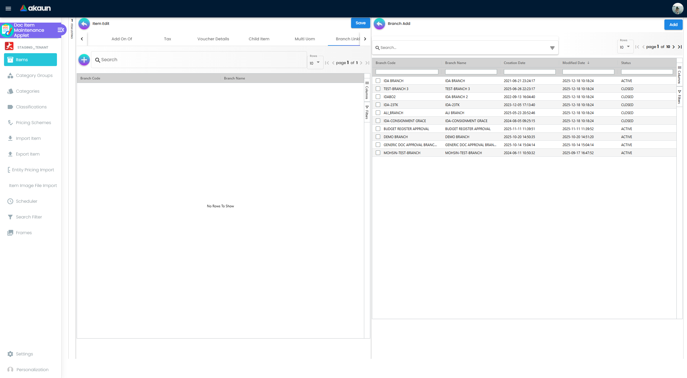 - Branch/Company Linking: Used to restrict an item to a specific branch or company; if not linked, the item cannot be used for transactions in that branch.