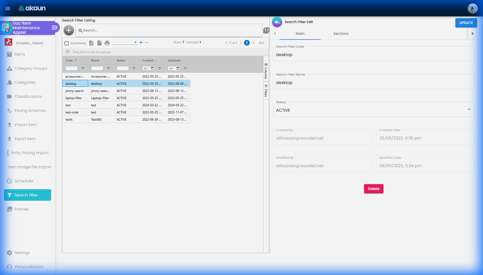 Click on any existing search filter in the listing to open the Edit panel. This panel displays the same fields as the Create panel. Updates can be saved, or the filter can be deleted from this panel.