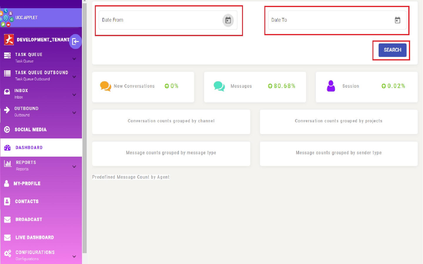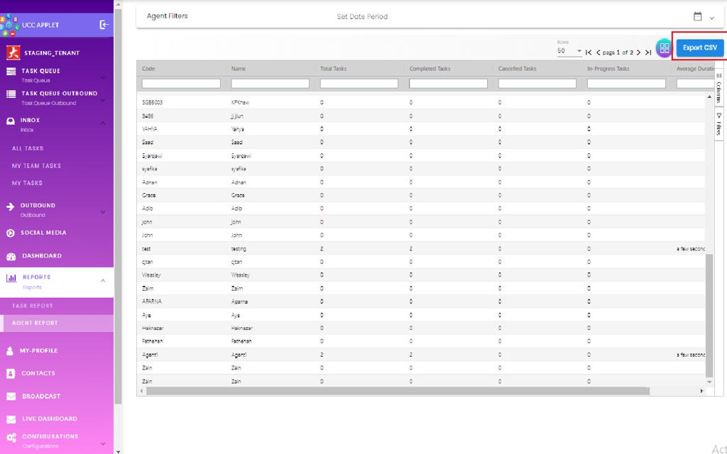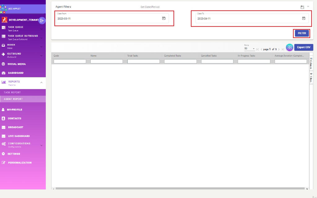 The Agent report shows a summary of agent activities in UCC, with each agent represented as a row containing their key performance metrics. To generate the report, “Date From” and “Date To” need to be selected and the filter button needs to be clicked.
