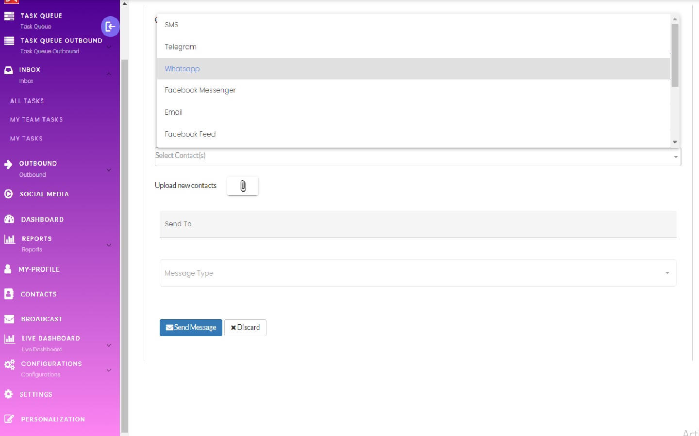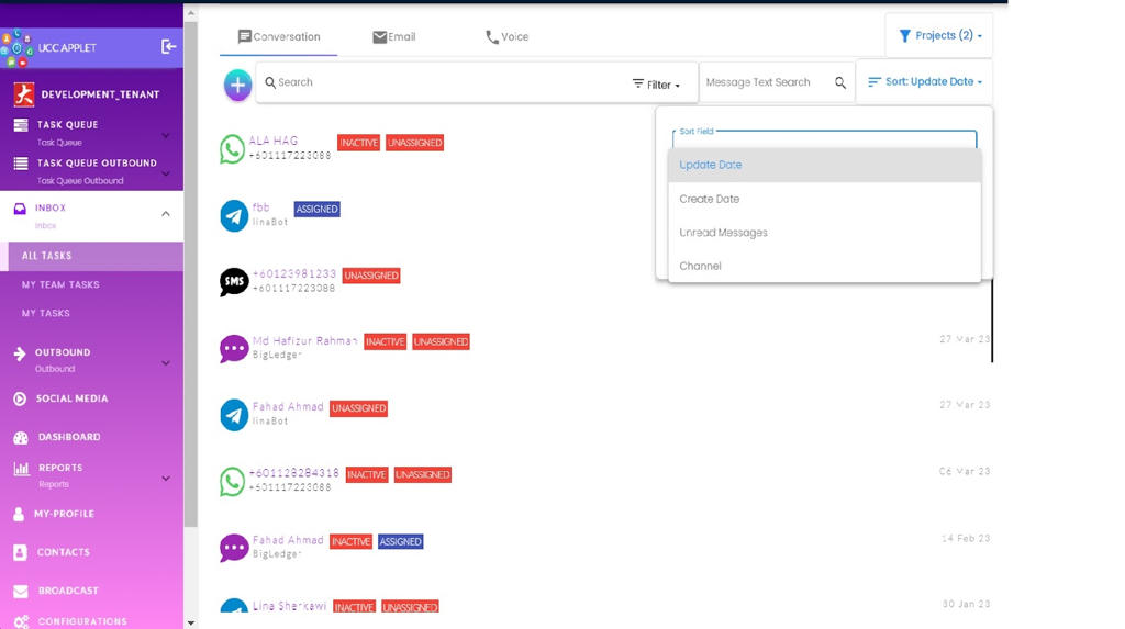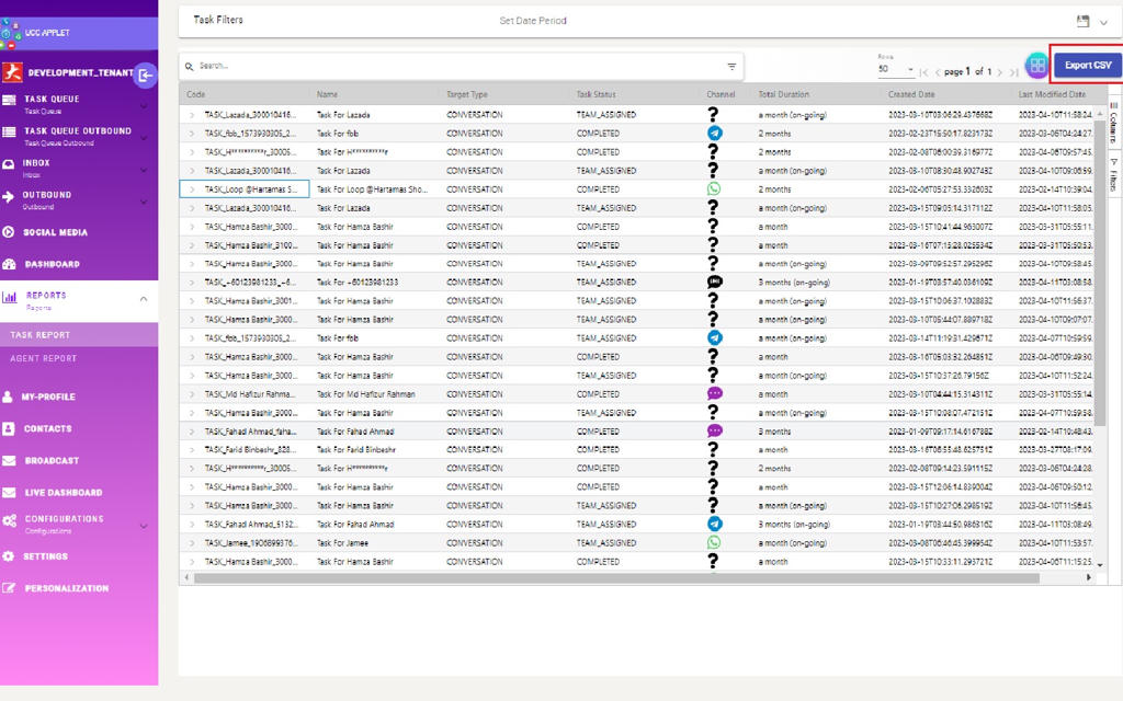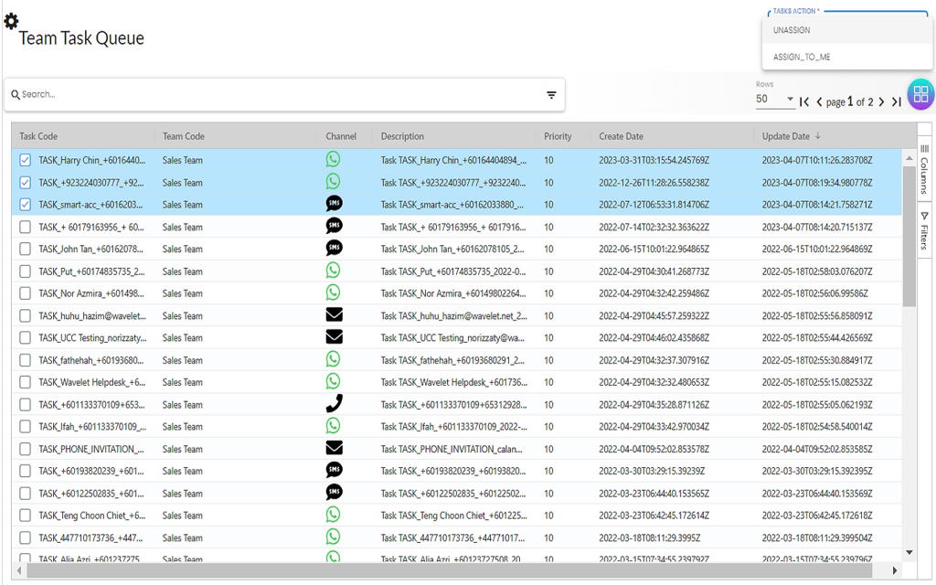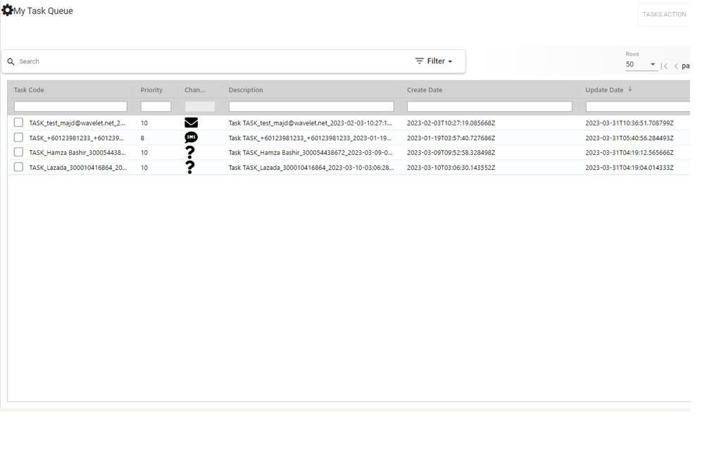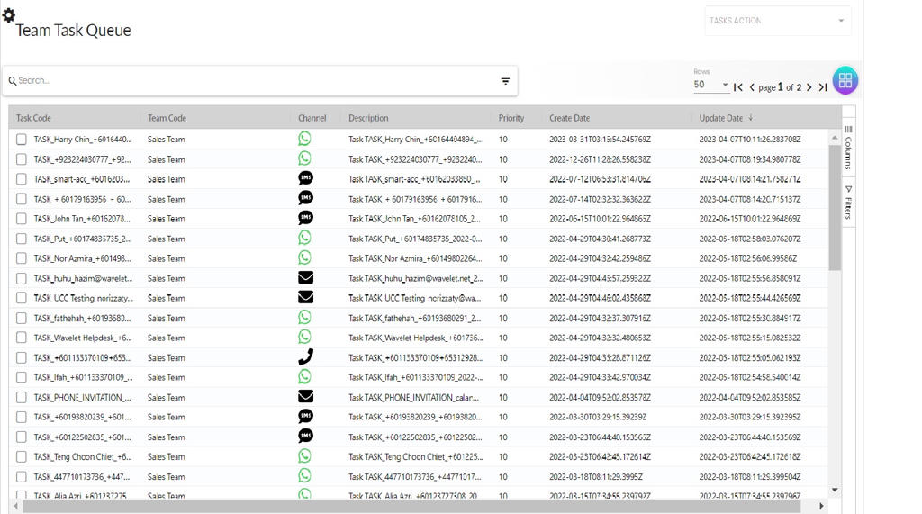 - Channel: Indicates the communication channel (WhatsApp, Email, SMS, Telegram Messenger, or Voice-Call) associated with the task, helping you understand the nature and context of the work.