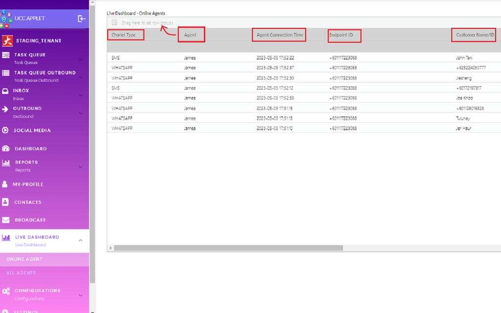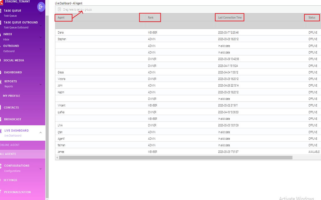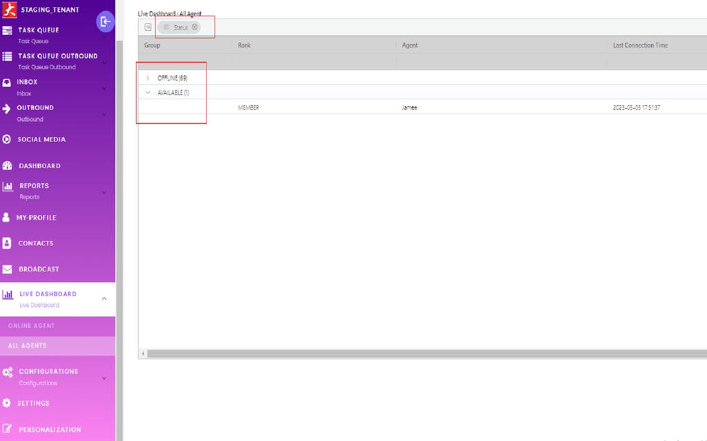 This page also supports grouping. Drag any column header to the grouping bar to reorganize the list—for example, grouping by status to see all available and offline agents together.