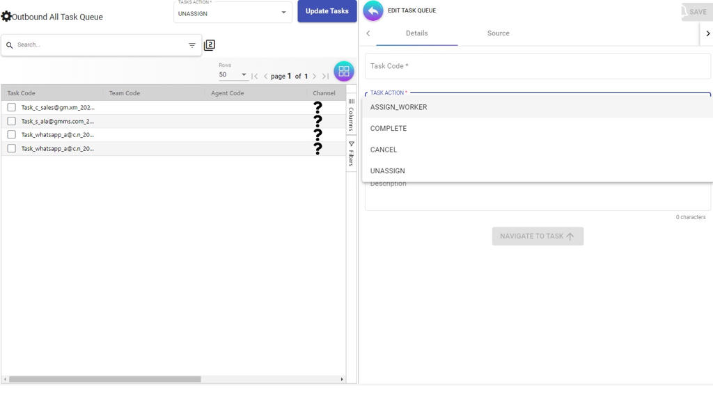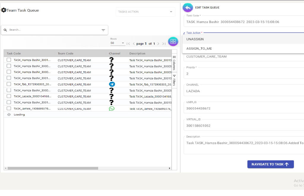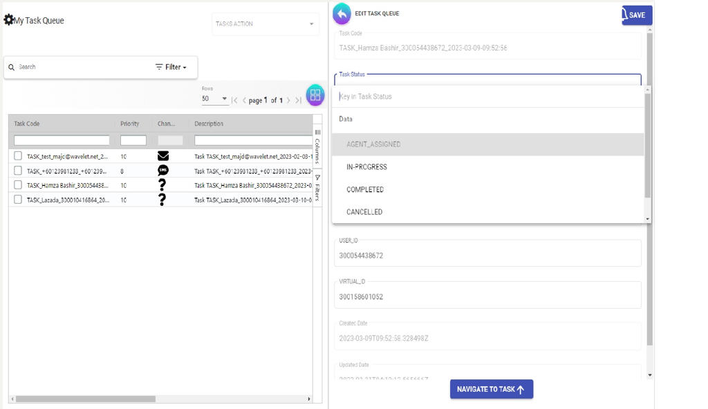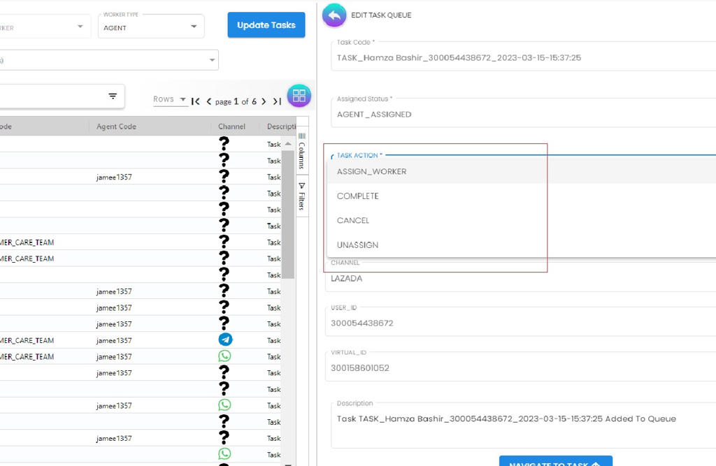 All available tasks details including, their details and assignment status. This centralized view allows supervisors to monitor workload distribution, identify bottlenecks, and ensure tasks are properly assigned across teams and agents.
