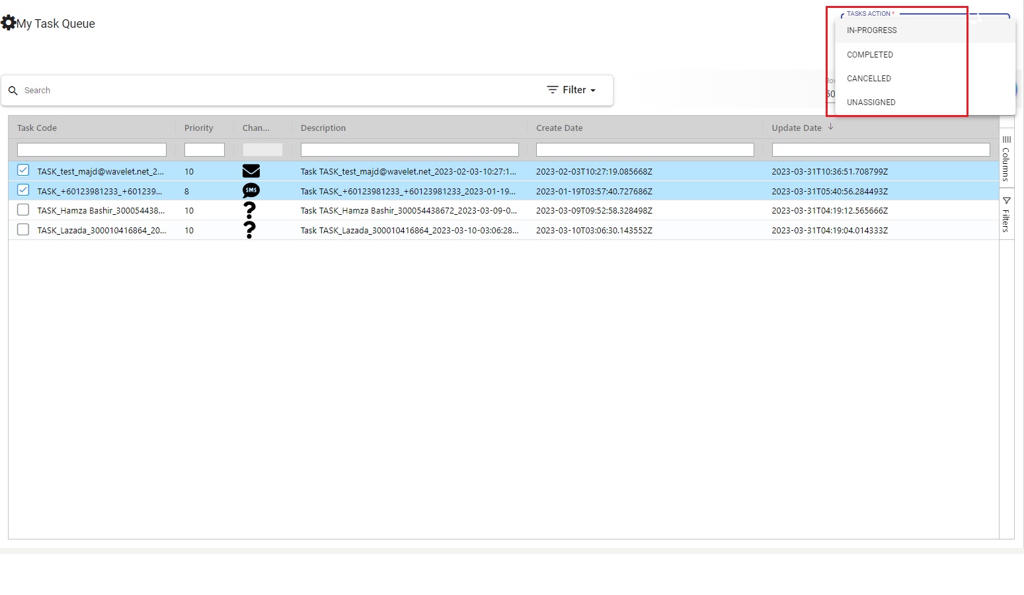 When you select one or more tick boxes in the all task queue listing component, the bulk actions dropdown will become active, allowing you to perform operations on all selected tasks at once.