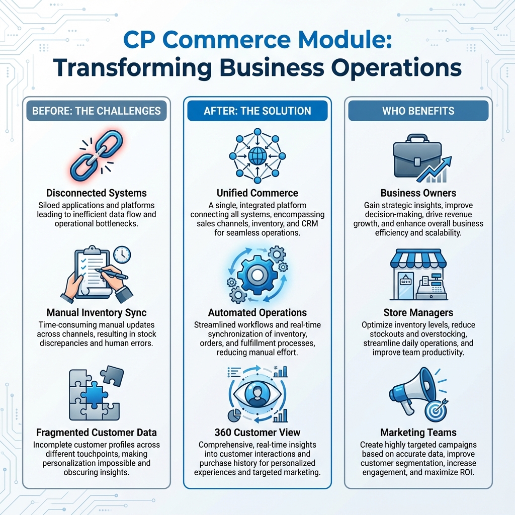 The CP-Commerce Module is where you define how your online business operates. It serves as the bridge between your back-office operations (Inventory, Sales, CRM) and your customer-facing digital storefront.